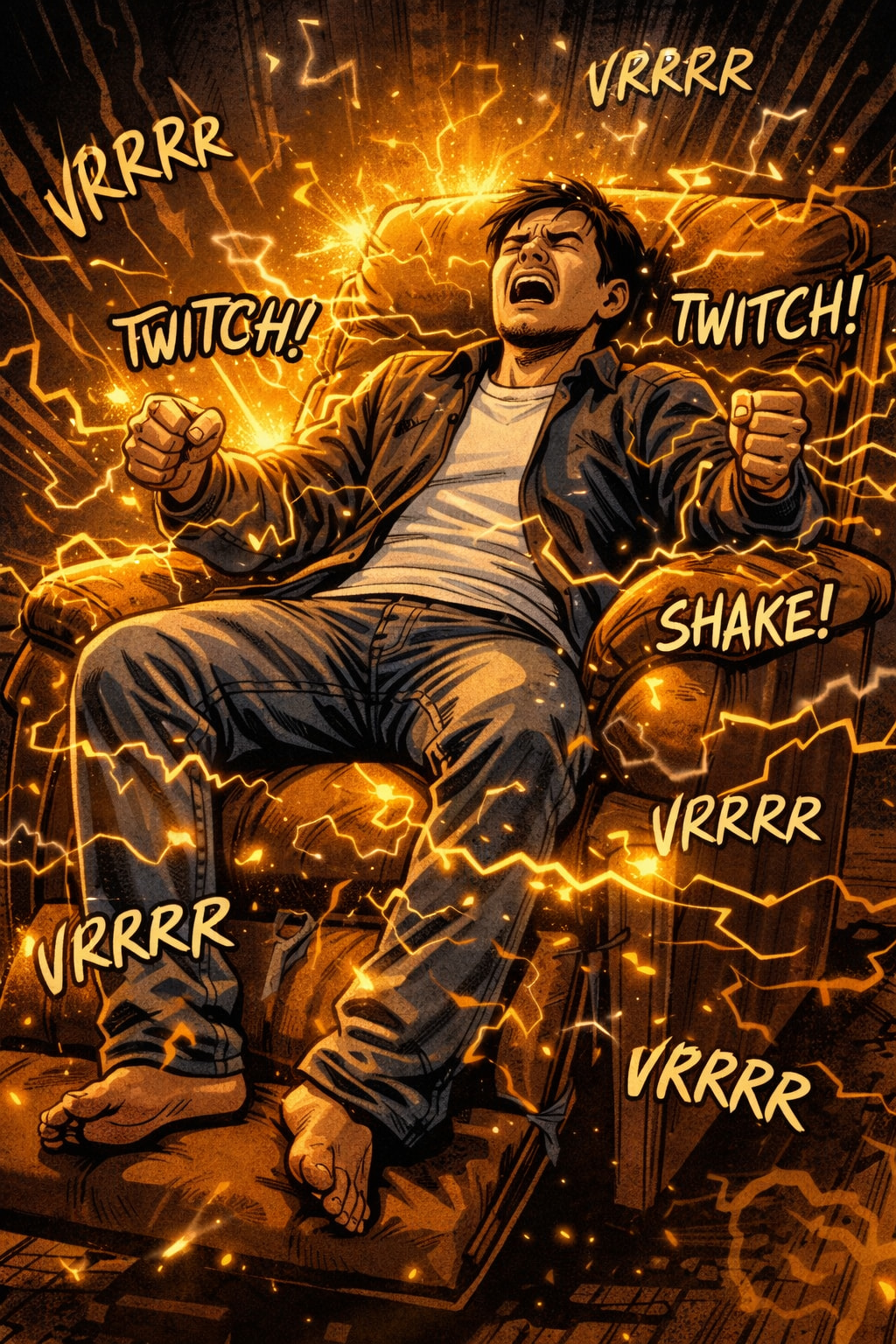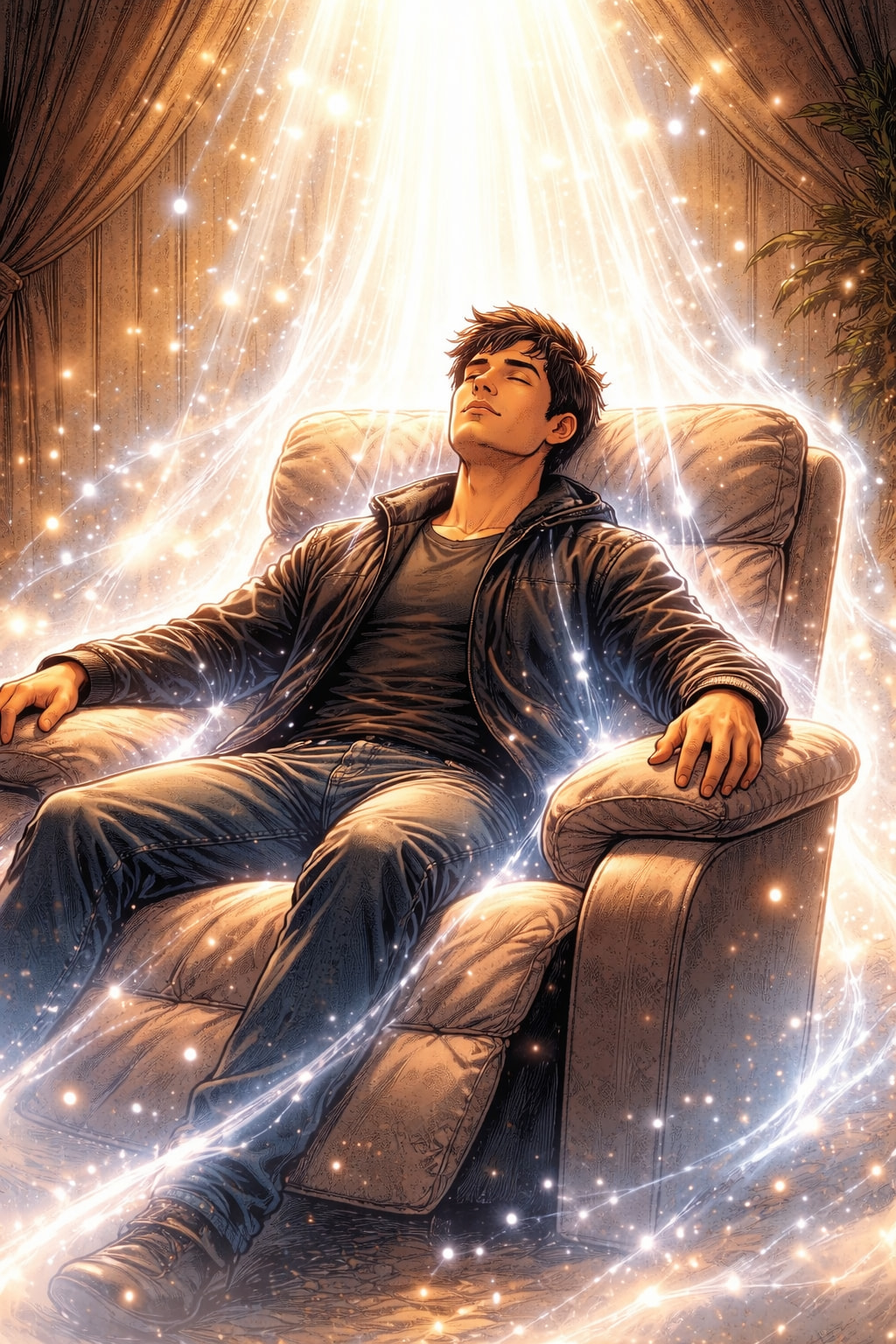Meanwhile, on the recliner, client’s whole body is twitching and hands and legs are stretched while on the steady relaxed healing state.