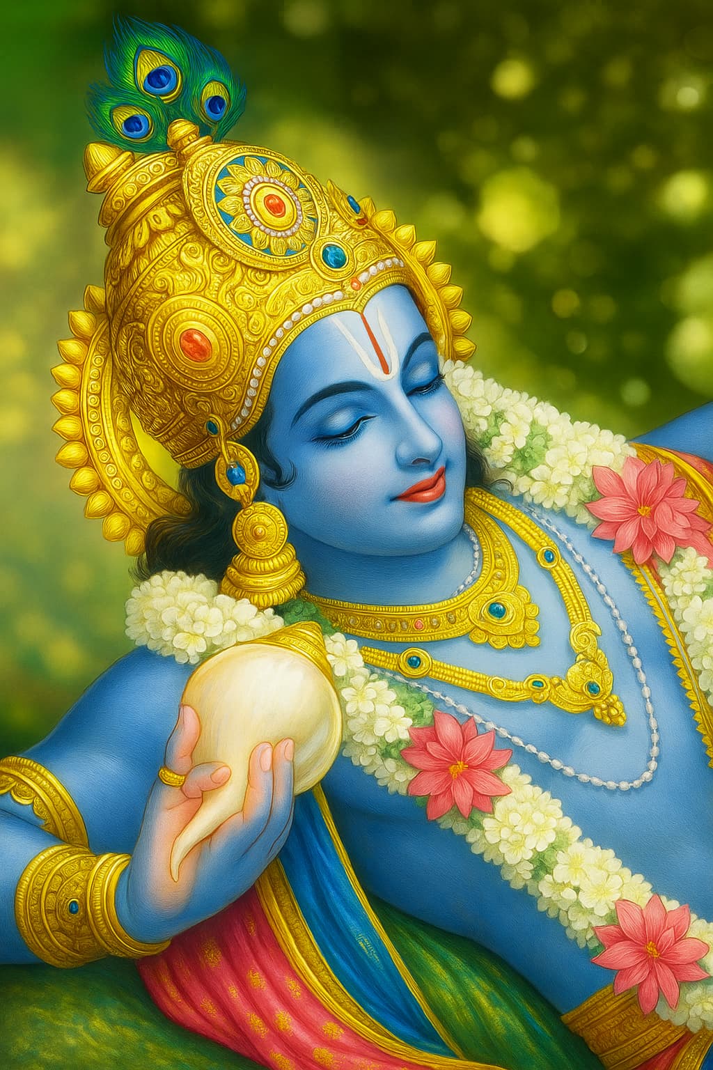 Then I moved from there again, I was seeing different dimensions (lokas). At one place I saw a big golden door, either sides of the door, a grand art in gold. I felt it should be the entrance for Swarga (Swarga) or Vaikunta. I went inside. I saw trees, bushes and flowers glowing bright in different colors. Cant explain in words. More than graphics. I couldn’t see anyone there. So, I started flying and I reached a place where everything was dark, very dark. Aftar few moments I saw a glowing golden Simhasana (Throne) floating, in which Lord Vishnu was sitting. I couldn’t see his face but saw the colour of his body and it was blue. So, felt it should be Lord Vishnu. Soon I saw one more glowing golden Simhasana floating, in which Maa Sharade was sitting weaning white saree. I saw Maa Sharade very clearly. Then I saw a glowing lotus floating, but couldn’t see Maa Lakshmi in it. Then saw Lord Vishnu going on Garuda