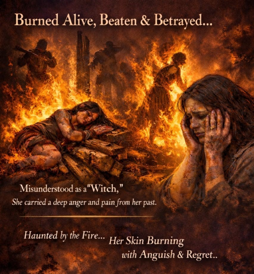 As the scene unfolded, she became aware of a bright light, which brought a sense of safety. Prior to this, she described feeling happy and free in the forest until encountering the sorcerer. He attempted to control her and kept her frozen using black magic, leaving her unable to move and in a state of fear. Client M continued to experience intense fear, describing it as being felt all over the skin, like fire. As the scene deepened, she saw herself being burned, feeling the skin burning while being unable to move, almost unconscious. She connected this directly to her current eczema, recognizing the same burning sensation in her body.