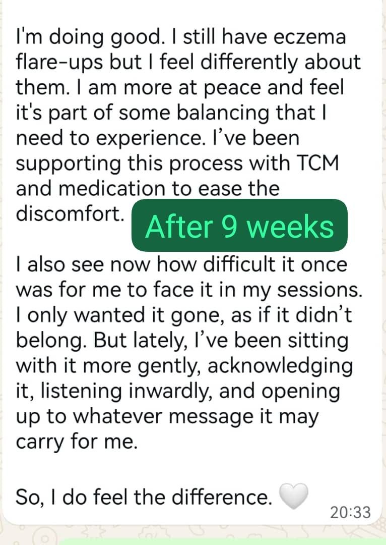 - You began to see your eczema differently. You recognise that your eczema may not only be a physical condition but also connected to deeper emotional memories, including feelings of anger, fear, and experiences related to burning or harm that surfaced during the regression.
