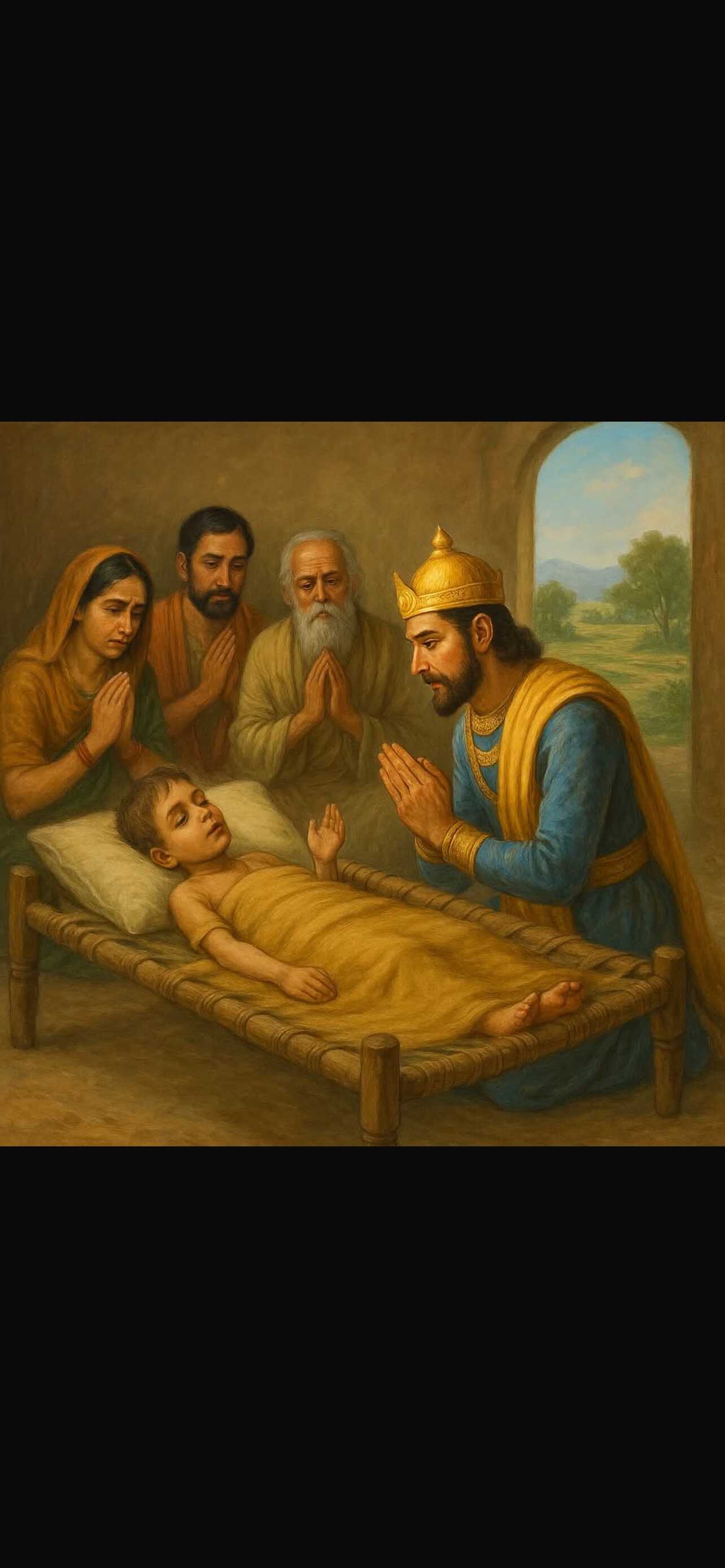 The king was astonished. Two sages, now a dying child! Yet he did not give up. He galloped to the village and found a house full of sorrow. The child lay weak and pale, surrounded by weeping family members. Despite his frailty, his eyes shone with peace.