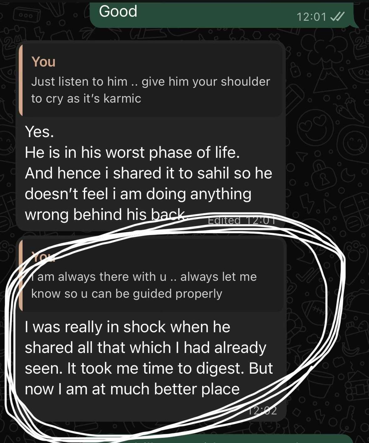 - She had gone for a solo road trip to Himachal in August for 15 days where she met another biker Mr. Z. For 1 st 11 days their was no interaction but last 4 days of the trip they came so close to each other that they shared all the details and would talk to him whole night and day with sleepless nights . After she came from that ride she has always felt a pull towards Mr.Z ( who was already married and having a kid but they leave separately). The pull was so strong which even made her visit bangalore where he resides in October before her marriage ( here too she claims they had so many chances but never had physical contact till date )