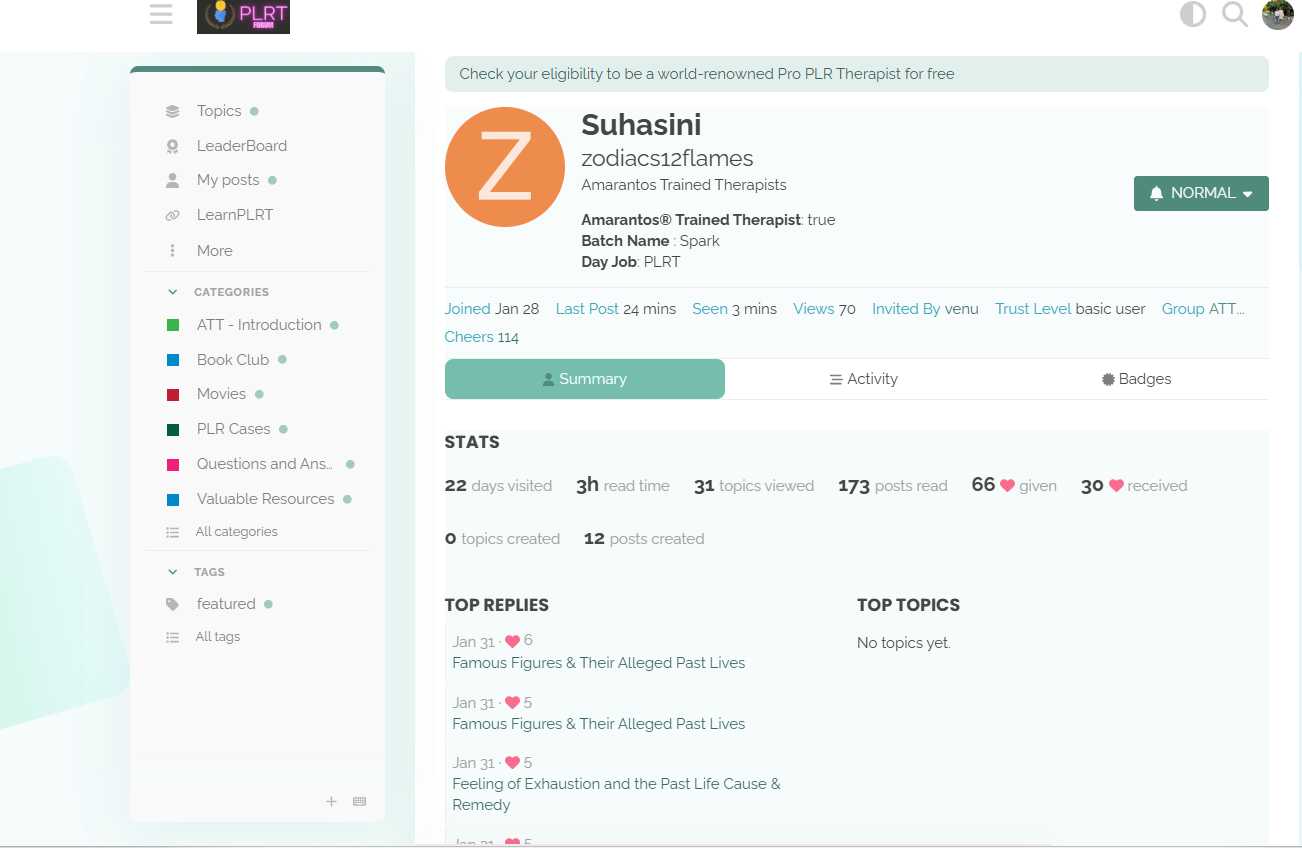 If you would like to read about posts or cases submitted by any therapist just go to their profile and look under top topics .