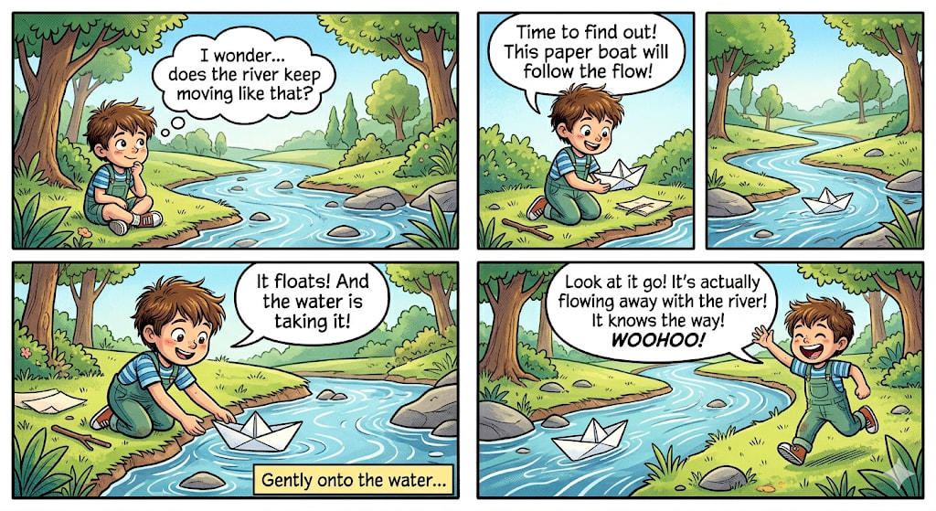 Just like a small kid observes how a river flows and how the paper boat floats and flow through water.