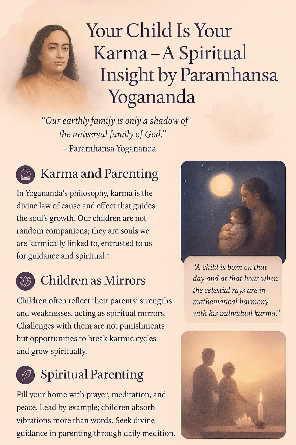 Paramhansa Yogananda, the renowned spiritual master and author of Autobiography of a Yogi, reminds us that nothing in life is accidental. His profound insight, “Your child is your karma,” reframes parenting as a sacred spiritual assignment. Children are not mere companions or extensions of ourselves—they are souls entrusted to us to guide, nurture, and reflect back the lessons of life.